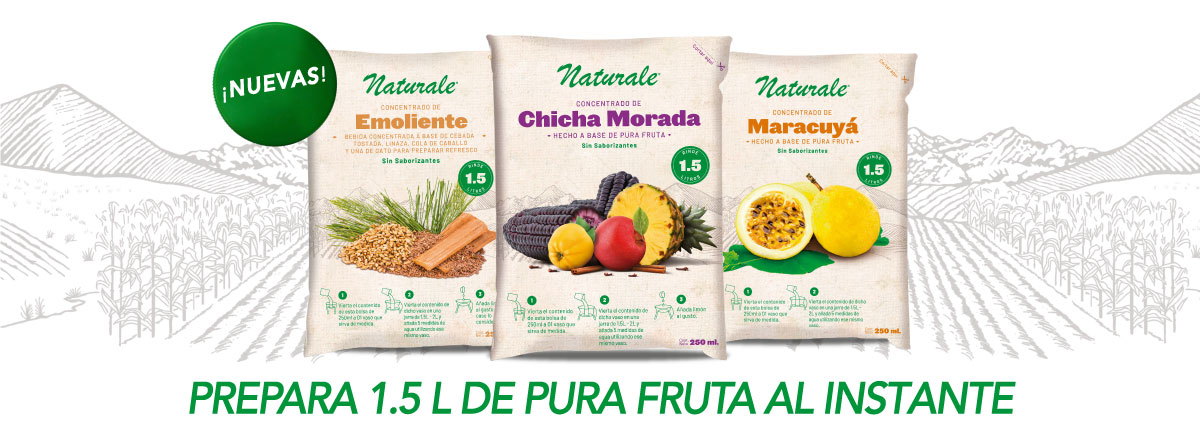 La Chicha Morada es la bebida no gasificada más consumida en el País. Nuestro concentrado de chicha morada NATURALE está hecho a base de pura fruta, sin ningún tipo de saborizante y respetando todos los ingredientes de la receta tradicional: Maíz morado, Membrillo, Piña, Manzana, Canela y Clavo de olor. Toda esta deliciosa combinación viene lista para que la prepares en 3 simples pasos, le añadas tu toque secreto y la disfrutes en familia.